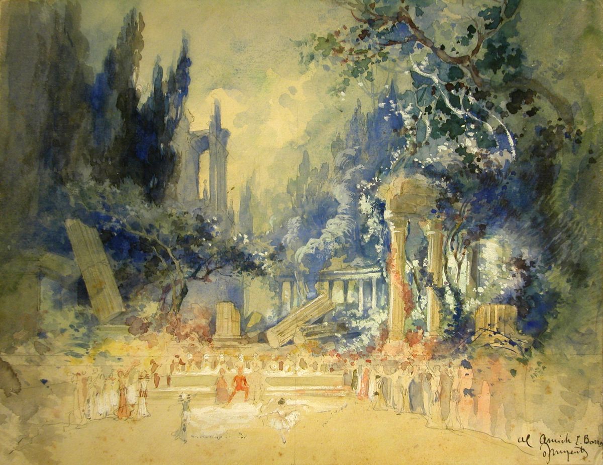 En tornar de París es dedicà principalment a l’escenografia per a diferents teatres de Barcelona. Va col·laborar amb Adrià Gual portant a terme algunes decoracions de la «Sèrie de les Arts» per al seu Teatre Íntim el 1903-1904 (El barber de Sevilla, La Margarideta, L’ordinari Henschel, Mestre Oleguer, Els teixidors de Silesia), al Teatre de les Arts. En paral·lel, treballà per al Gran Teatre del Liceu, on destacaren especialment els seus treballs per a les òperes wagnerianes El capvespre dels déus, La Walkiria, Els mestres cantors de Nuremberg o Tannhäuser, però també per a òperes tan destacades com Louise, Faust (figura 1) o Thaïs. En aquests anys de la primera dècada del segle XX també va ser un dels escenògrafs en plantilla dels cèlebres Espectacles i Audicions Graner al Teatre Principal (temporades 1905-1907), un dels projectes més innovadors i moderns de l’escena catalana del moment, impulsat pel pintor Lluís Graner, l’objectiu del qual era assolir la síntesi de les arts (El comte Arnau, La matinada, La nit de Nadal, La presó de Lleida, Fra Garí, La Santa Espina o Ton i Guida), així com del Teatre Eldorado el 1905 (Filemón y Baucis o Djamileh).