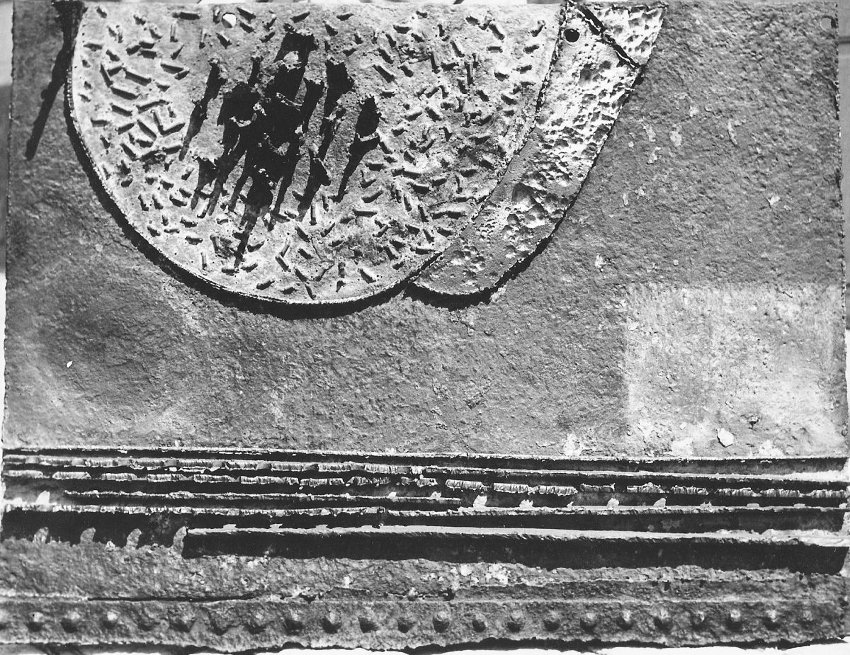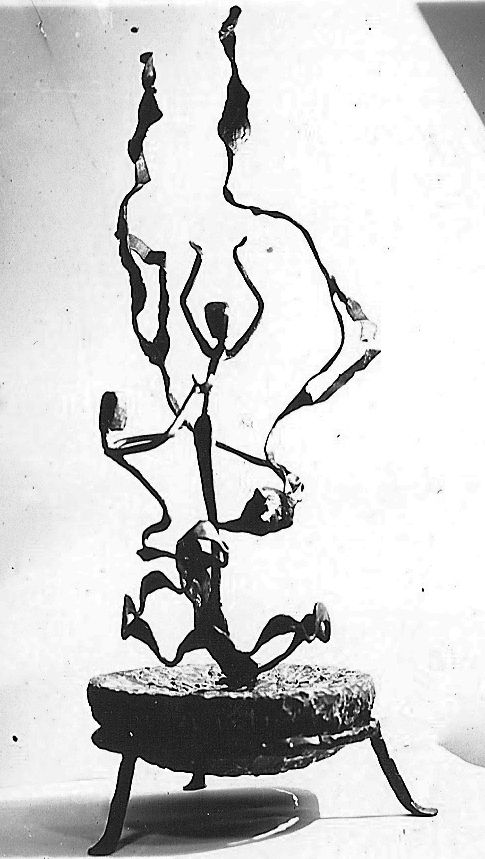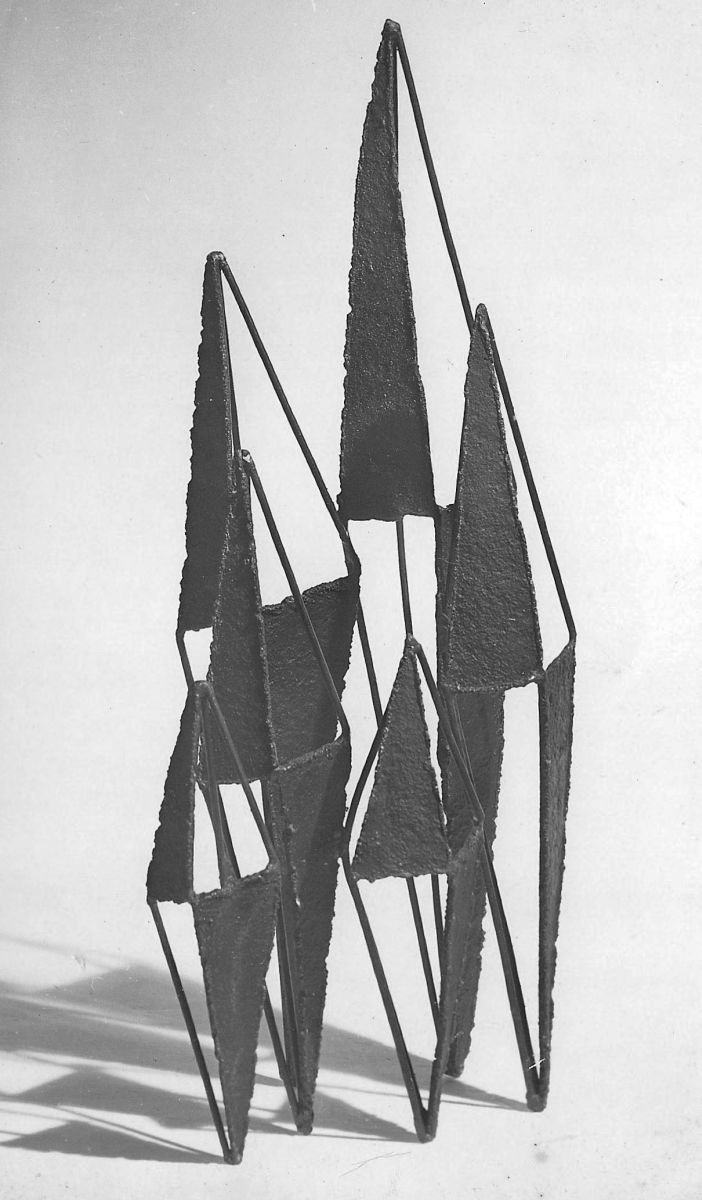 L’any 1957 és un any especialment significatiu en la biografia de Francesc Barceló, perquè és l’any del seu casament amb Mercè Casals i del trasllat posterior a la Ciutat Comtal. També va ser un any prolífic pel que fa a exposicions, amb tres mostres individuals. En primer lloc, l’exposició del mes de febrer a Bilbao, a la Sala Mercado Artesanía, serà molt semblant a les realitzades l’any anterior a Madrid i València. A la celebrada el mes de març a les Galeries Costa, en canvi, hi ha diverses novetats: la introducció del pla com a element constructiu del volum, l’elaboració dels primers relleus (en una combinació de pintura i forja encara molt distant del que seran més endavant els seus relleus en planxa de ferro) i una incipient incursió en l’abstracció en alguna de les peces (figura 2).